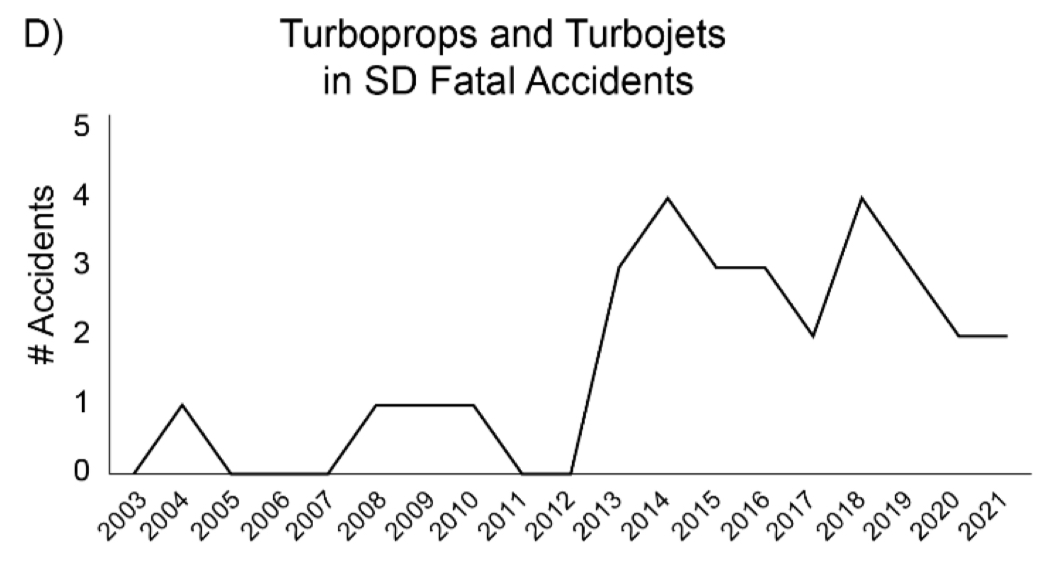 Smart students of statistics may point out that the graph above could be an example of the denominator changing (total accidents) and not the numerator (SD accidents). GA accidents overall and fatal accidents in particular are both down since the early 2000s, so if SD accidents are holding steady, they might make up a higher share of a smaller total. Again, though, the numbers disagree. Fatal GA accidents have declined from an average of 324/year in 2003-2006 to an average of 218 in 2018-2021, a drop of 33%. Over that same timeframe, fatal SD accidents actually increased, from an average of 17 to an average of 24—a 41% rise.