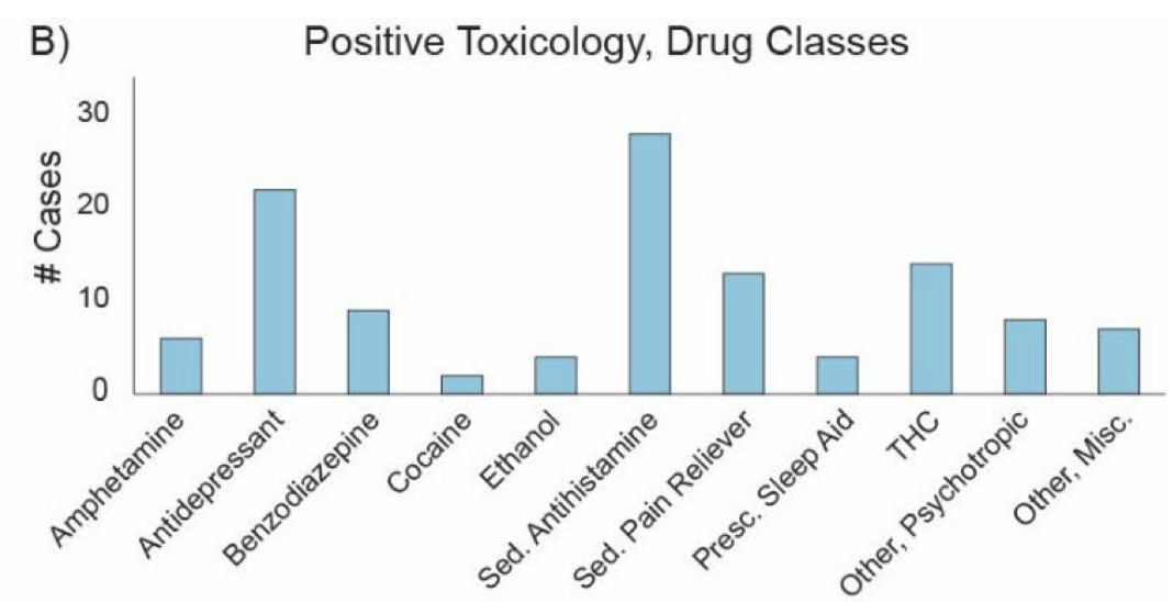 These positive toxicology results were almost all drugs, as alcohol was a rare finding. What drugs were these pilots taking? Mostly cold medicine, but antidepressants are a close second, and even THC is creeping up:
