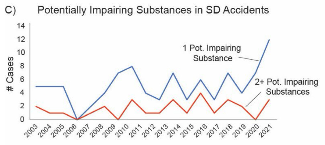 The FAA report also points out the uncomfortable reality that “potentially impairing substances” show up in an increasing number of NTSB reports. In fact, over the 2003-2021 timeframe, “A total of 90 out of 367 (24.5%) fatal pilots had a positive toxicology result.” That one quarter of accident pilots were potentially impaired seems incredibly high, and not something we should sweep under the rug.