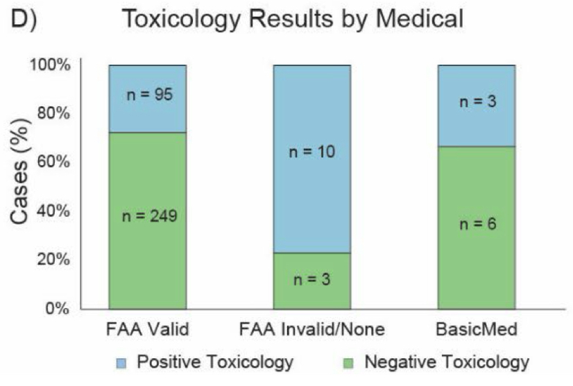 Some of these pilots are probably just rule-breakers by nature. Notice in the graph below that 77% of accident pilots who did not have a valid FAA medical tested positive for toxicology. That suggests these pilots knew they weren’t 100% healthy, and chose to fly anyway. It’s doubtful that a better flight review or a new regulation would change these pilots’ behavior. Even excluding those pilots, though, 28% of pilots with a valid FAA medical tested positive.